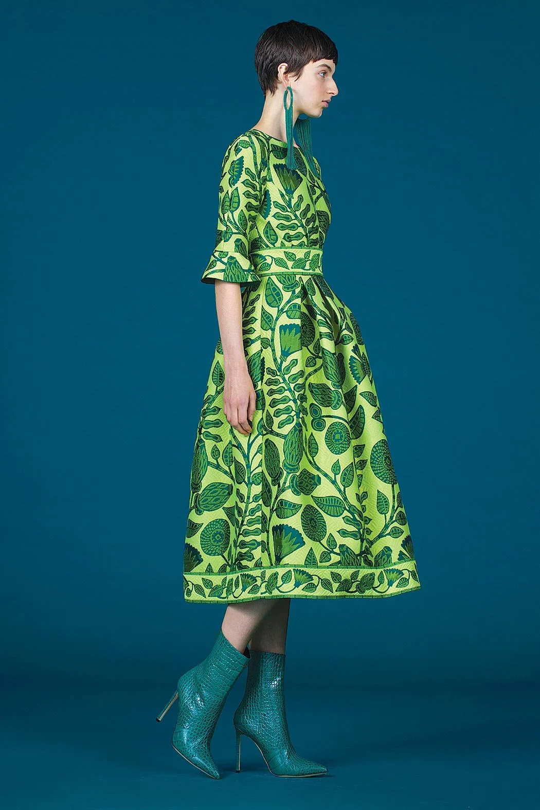 Equally stunning is an emerald-green ensemble designed for Catherine, Princess of Wales, in 2023. According to the curators, the green references the Princess’s appointment as Colonel of the Irish Guards.