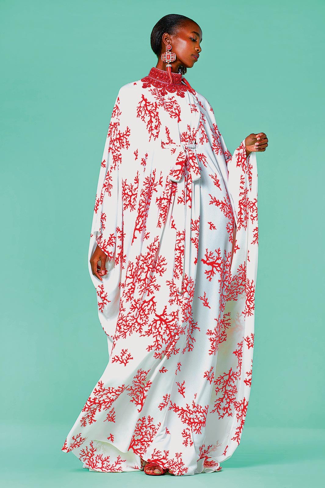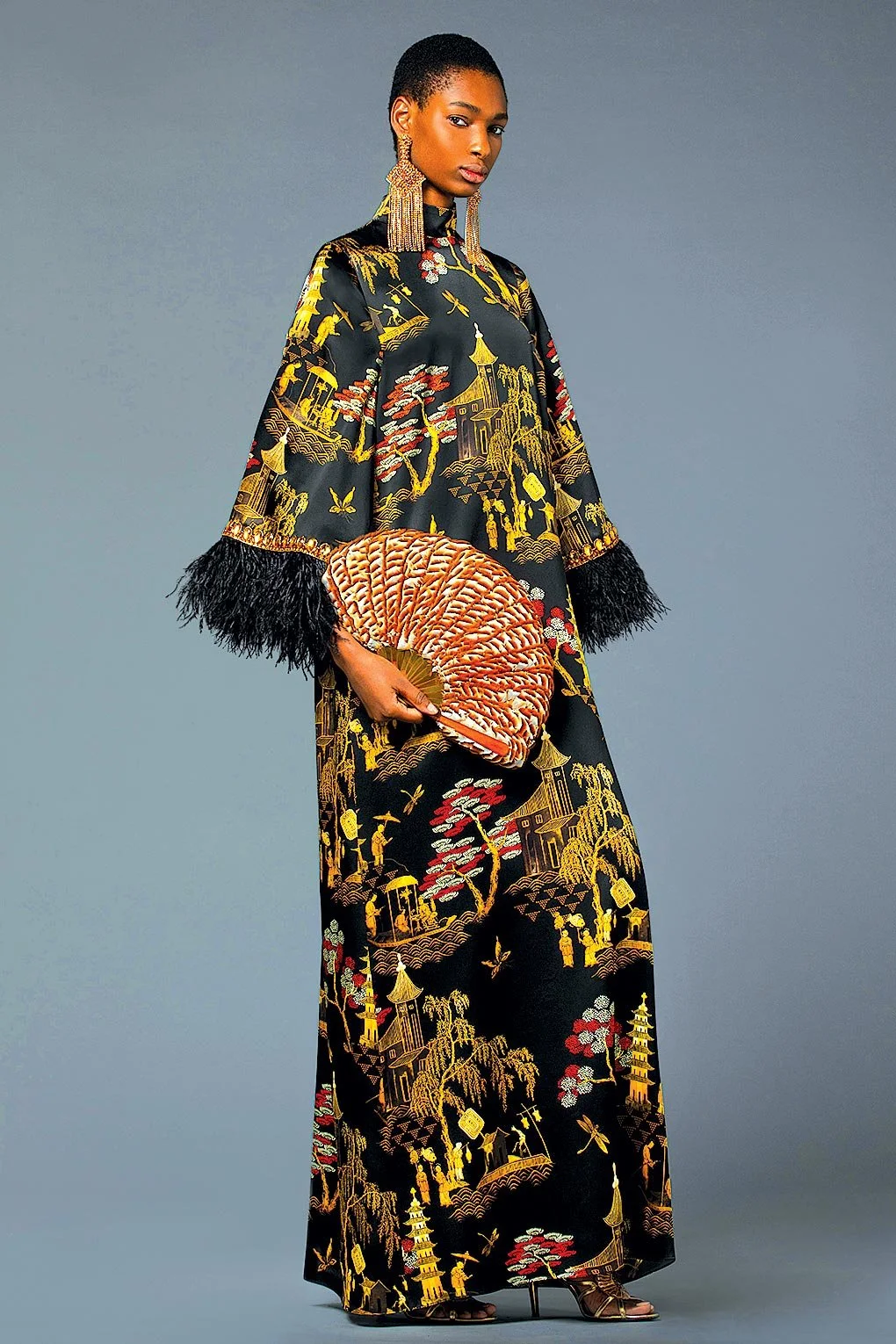 COROMANDEL PRINT SATIN SILK CAFTAN with embroidered trim and ostrich feathers, 2021. Promised gift of Andrew Gn. Peabody Essex Museum. Photograph courtesy of House of Andrew Gn.