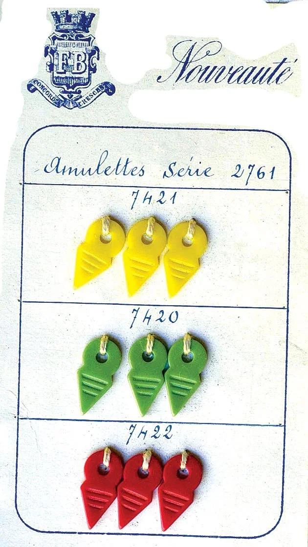 CZECH MOLDED GLASS TALHAKIMT versus unidentified amulet, perhaps stylized claw; lower image of Czech versus French talhakimt, with the translucent blue one much simpler and closer to agate examples. Above examples from Rita Okrent and the Picards.