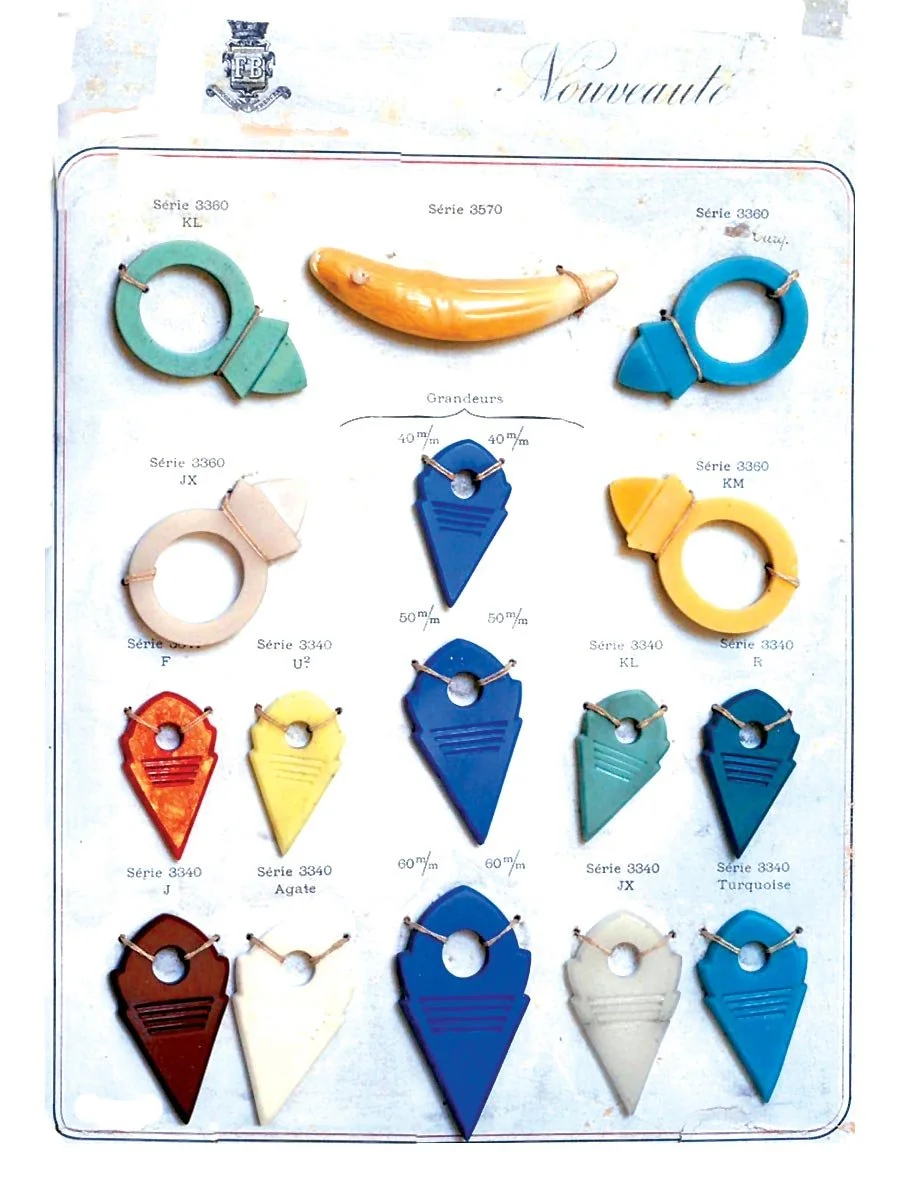 FRENCH PROSSER MOLDED GLASS TALHAKIMT, TURM RINGS AND IMITATION LION’S TOOTH in various sizes, colors, some rarely seen in the African trade and much less numerous than Czech molded glass. All the French glass examples more closely follow agate prototypes, as they are more simple than Czech examples, except for color. The glass lion’s tooth is painted in near natural colors. All French Prosser sample cards courtesy of Ruth and John Picard.