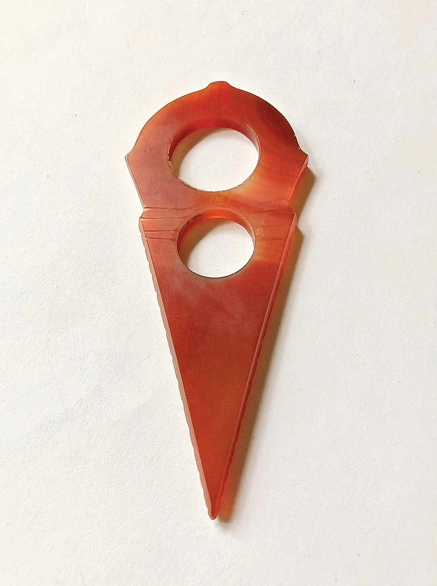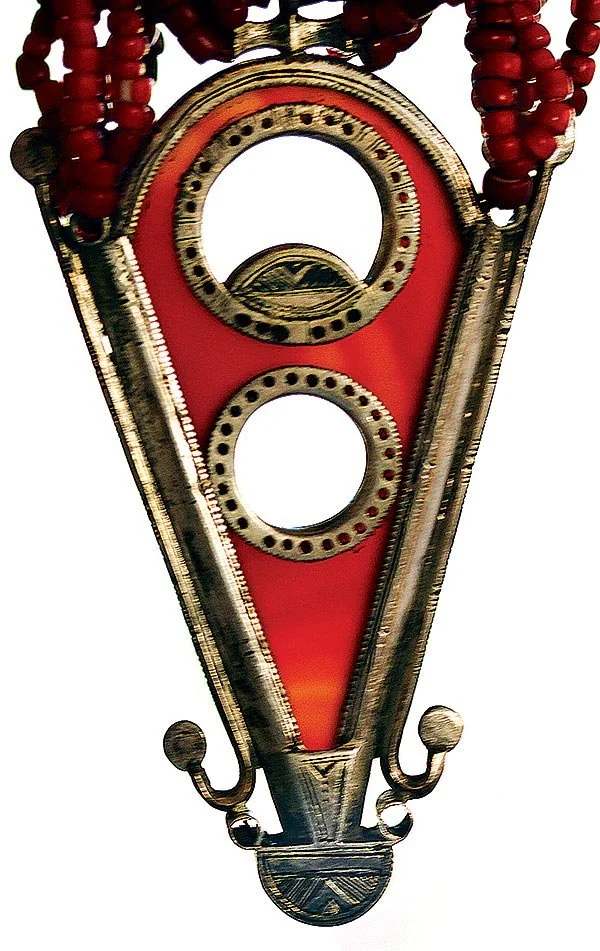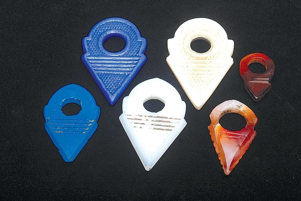 Recently, while photographing for Jocelyne Okrent, the daughter of the late Rita Okrent, a talented necklace designer, dealer of ethnographic beads/ornaments, and a longtime friend, she showed me new purchases of rare Cambay agate talhakimt (also spelled talhakim or called tanfouk), which I had not seen since the 1970s, and some molded glass Czech imitations of these same amulets. I had long been interested in these Indian amulets that were worn only by Tuareg women, first described by Arkell (1935a, b) as a fertility amulet, in the form of a stylized female groin and genitalia, with edge serrations as stylized pubic hair and augmented in power by its red color, and also the intense competition among Asian and European producers of beads and amulets for the African trade (Kaspers 2018, Liu 1977, 1987; Picards 1995).