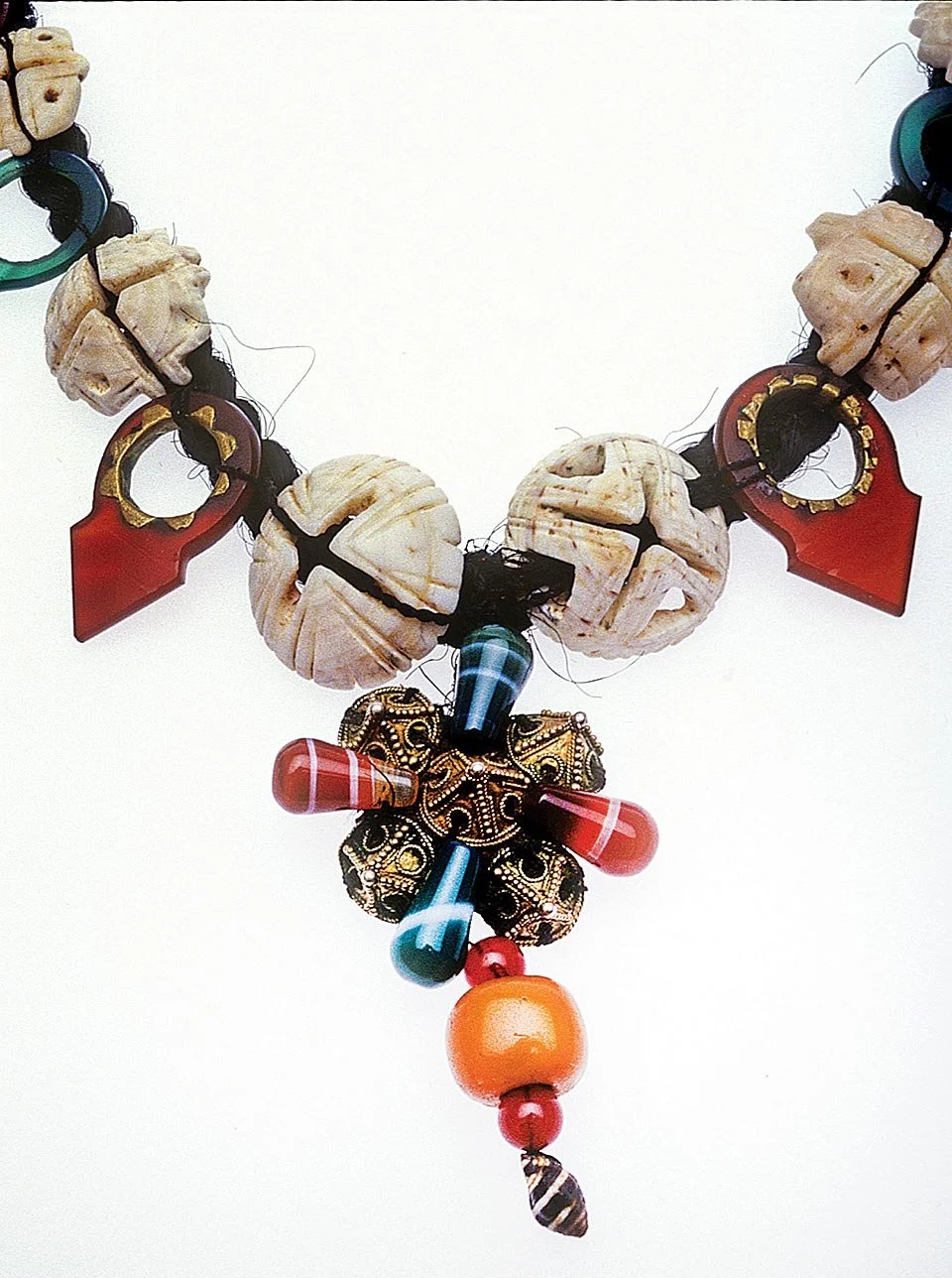 Images on left: IDAR-OBERSTEIN TALHAKIMT WITH TWO HOLES, image downloaded from Internet. Right-hand image of similar Idar talhakimt, mounted elaborately by a Tuareg smith; until I recently saw these two hole talhakimt on the Net, I thought that Tuareg jewelers drilled the second hole. Note the precise metalwork done by the Tuareg smith, showing they are the best jewelers in Africa. Right-hand photo by Robert K. Liu/Ornament. Images on right: RARE TUAREG NECKLACE STRUNG ON HUMAN HAIR, using carved cowrie disks, Idar-Oberstein sourced talhatana mounted with brass, some barely visible green dyed Idar amulets, Idar dyed agate drop pendants, Mauritanian brass beads, unidentified red beads, copal imitation, and an Engina shell. Courtesy of the late Elizabeth J. Harris. TUAREG TADNIT NECKLACES worn by adult women, strung with long silver cylindrical beads, ellipsoid glass beads, small triangular agate and silver pendants, small black and blue beads, and large Idar talhakimt, two silver Tuareg tanaghilt or Tuareg crosses, and a large silver diamond-shaped silver pendant with dangles, almost identical to necklaces shown in Arkell, as well as different types of necklaces worn by Tuareg women of various social classes in Darfur, Sudan (1935a), sketched in Liu (1977). This photograph was taken many decades ago in a British museum, possibly by Sue Heaser.