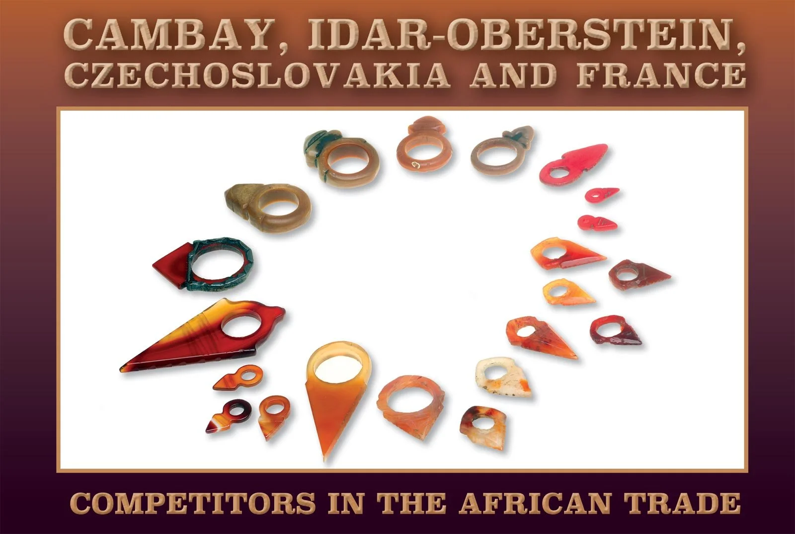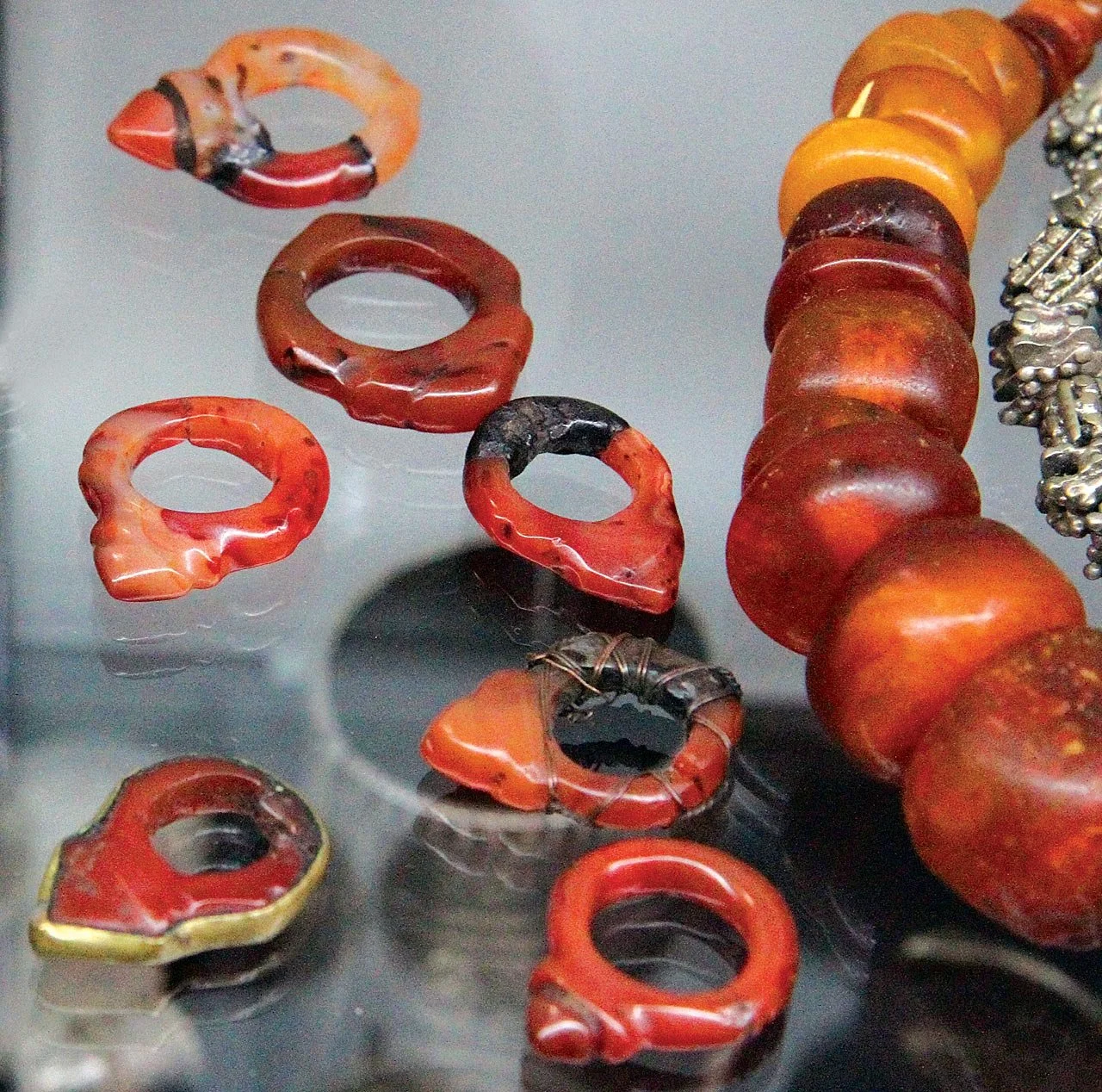 COMPARISON OF CZECH MOLDED GLASS TALHAKIMT AND CAMBAY AGATE AMULETS, showing the vast differences between how these were presented. While molded glass ones were numerous in the African trade, how they were used is not well known. The very large difference in size, shape and color demonstrates the enigma of why copies were accepted by the end users (Liu 2001). While the Cambay agates were used by Tuaregs, the glass ones are most often seen as temple dangles among Guedra dancers (Fisher 1984). The intense red of the glass copies probably enhanced their role as fertility amulets. Courtesy of Jocelyne Okrent.