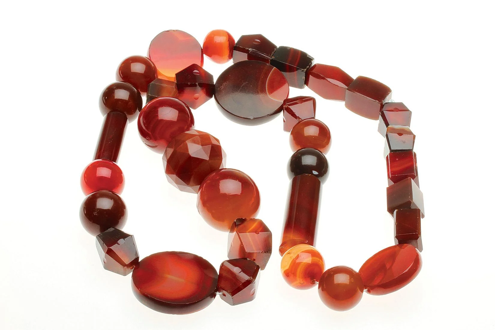 STRAND OF IDAR-OBERSTEIN AGATE BEADS, beautifully ground/faceted/polished and in deep shades of red, reasons why they were so successful in the African trade versus Cambay products. Note little distinctions like the notch on some bead edges. Faceted round beads are 2.8 centimeters diameter.