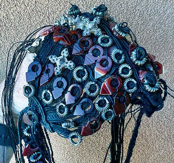 VERY RARE TUAREG WOMAN’S HEAD DRESS possibly strung on hair, decorated withlarge numbers of Idar-Oberstein banded agate talhakimt and cast Tuareg silver ornaments. The long strip on the left has what may be three agate turm rings. The large numbers of agate amulets used on each head dress may account for the large numbers of such agates being in the African trade. Photograph courtesy of Thomas Stricker.