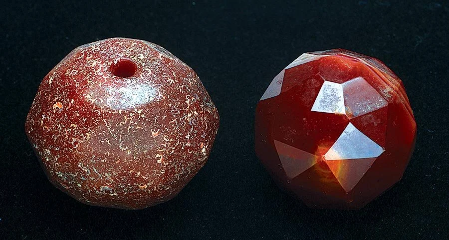 CZECH VERSUS IDAR FACETED BEAD showing how badly glass wears in comparison to agate; from Mali, respectively 2.8 versus 2.5 centimeter diameters. Courtesy of Penny Diamanti, 2001.