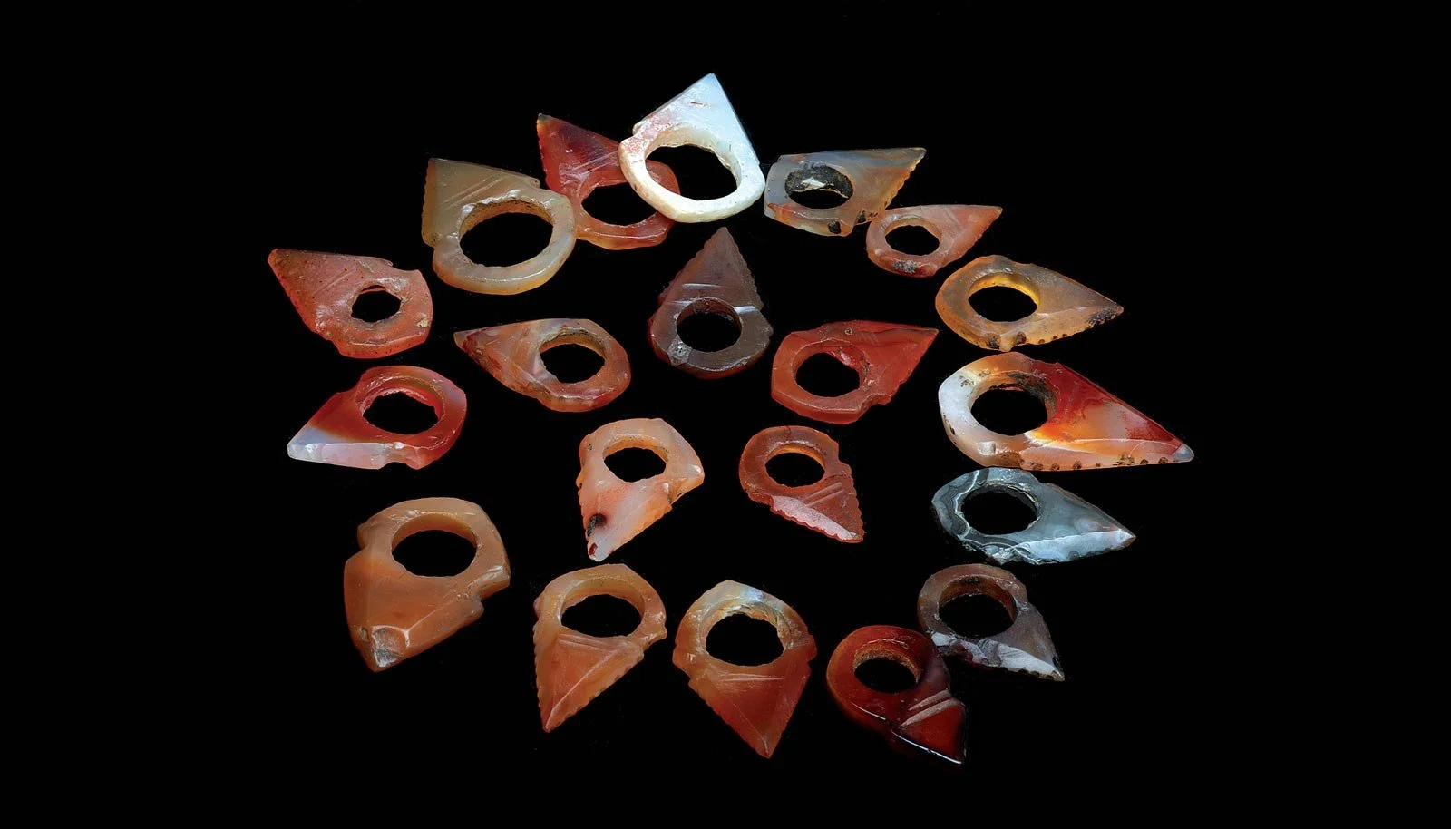 RECENT PURCHASES OF RARE CAMBAY AGATE TALHAKIMT from Burkina Faso and Niger. I have not seen this type of fertility amulets for the Tuareg since the 1970s. Using reflective and transilluminated light, one can see the large degrees of variation in the agate colors after heat treatment, due to how well the technique worked or the quality of the original agate. The light grey and dark gray examples show either a failure of the heating process or finished pieces that were not treated. Note the variation in the size of the core drilled holes, proportional to the width of the amulet. It is surprising that there would be so many core drills of slightly different diameters used. There is considerable variation in the edge serrations and horizontal lines just below the central holes. Amulets range from 2.4 to 3.9 centimeters long. Courtesy of Jocelyne Okrent.
