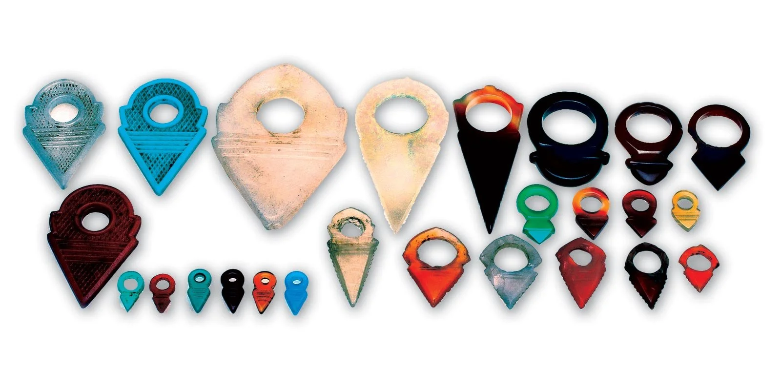 AGATE TALHAKIMT FERTILITY AMULETS FROM CAMBAY AND IDAR-OBERSTEIN, WITH CELLULOID AND GLASS AMULETS BY THE CZECH, and one homemade in Plex from Morocco. These range from 1.7 to 7.5 centimeters long. One of the celluloid amulets has been re-shaped to a more pointed shape by the user. Sourced from the U.S., Germany, Egypt and Morocco. Courtesy of the late Joel L. Malter, Dr. Peter W. Schienerl and Liza Wataghani. Photographs by Robert K. Liu/Ornament except where noted.