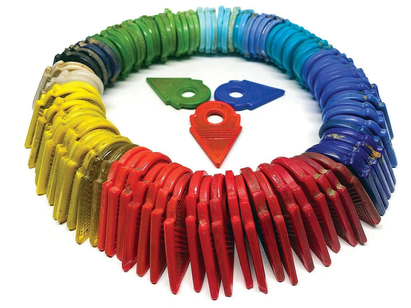 A LARGE NUMBER OF CZECH MOLDED GLASS TALHAKIMT, ARRANGED BY COLOR, showing the variation in the glass colors, which are usually uniform. The blues demonstrate the largest variation. Despite this large collection, there does not appear to be more than seven primary colors used, with transparent ones rare. Being molded, one would expect they would be very uniform in size, but a sample measured 5.5, 5.35 and 5.15 centimeters long; possibly due to differential shrinkage when fired. Photograph courtesy of Thomas Stricker.