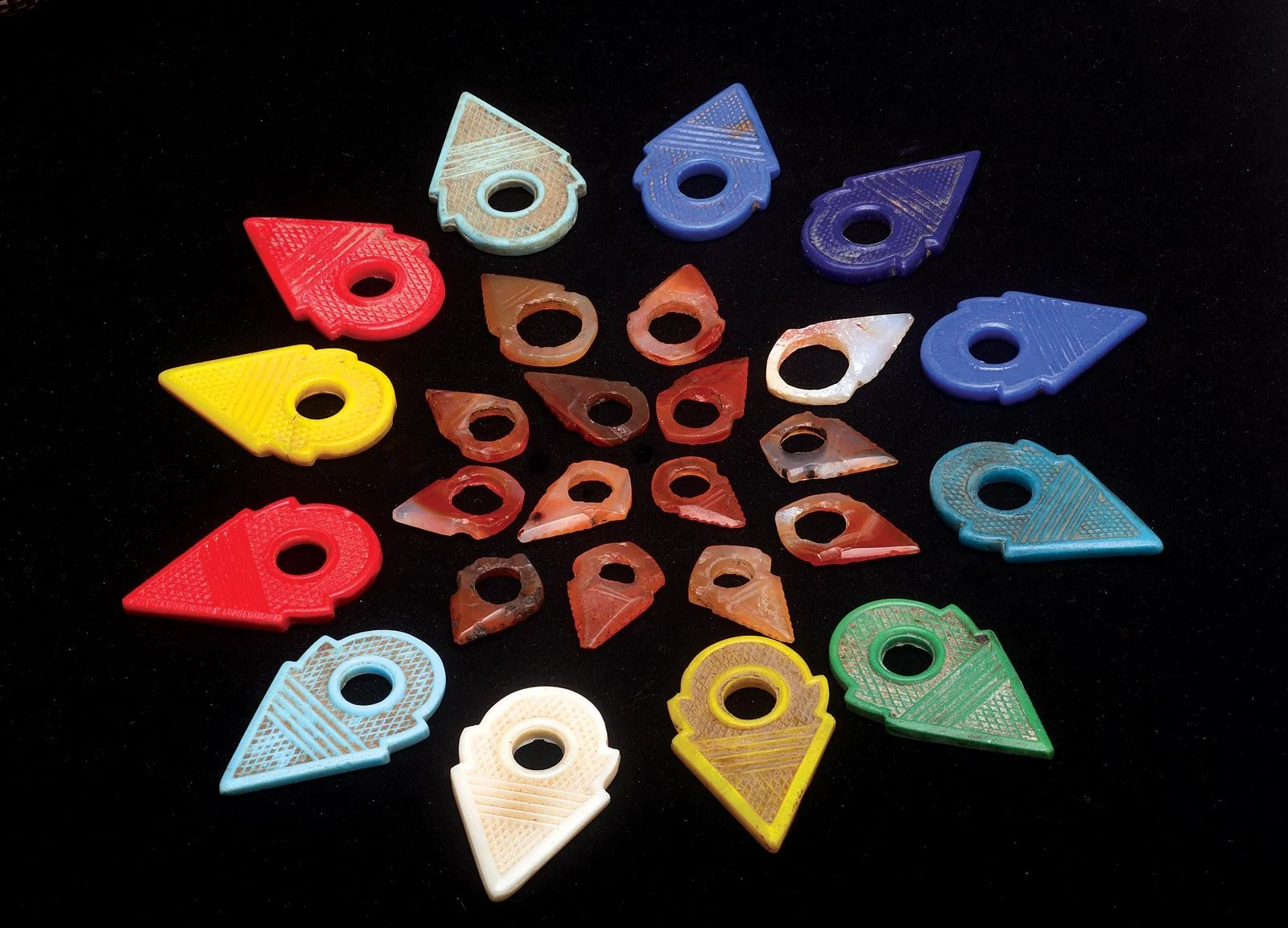 COMPARISON OF CZECH, FRENCH, IDAR, AND CAMBAY TALHAKIMT in molded glass and agate. Note that the two blue and white French molded glass versions on the bottom row are much closer to the Cambay prototype, except for size and color. The molded glass amulets are used in Mauritania as hair ornaments, dangling from the temples of non-Tuareg women, according to Thomas Stricker. Guedra dancers also wear talhakimt in their hair (Liu 1995). The puzzle is why these very different and colorful amulets are accepted, like so many imitations that are so easily differentiated from the prototype. Courtesy of Jocelyne Okrent, Ruth and John Picard, and Thomas Stricker.