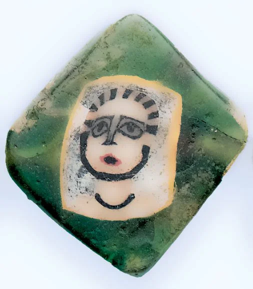 Figure 21. One of four tabular Gorgon beads recently excavated from Nubia, which may be from same cane; these came from a site dated AD 400-500 but were recognized by Then-Obłuska as older beads that had been re-used or as heirlooms. They are unique in having a red surrounding the yellow facial skin, with the red an integral part of the stylized snake hair, and a mouth reversed from the standard colors. Courtesy of Then-Obłuska SJE, MAUS.