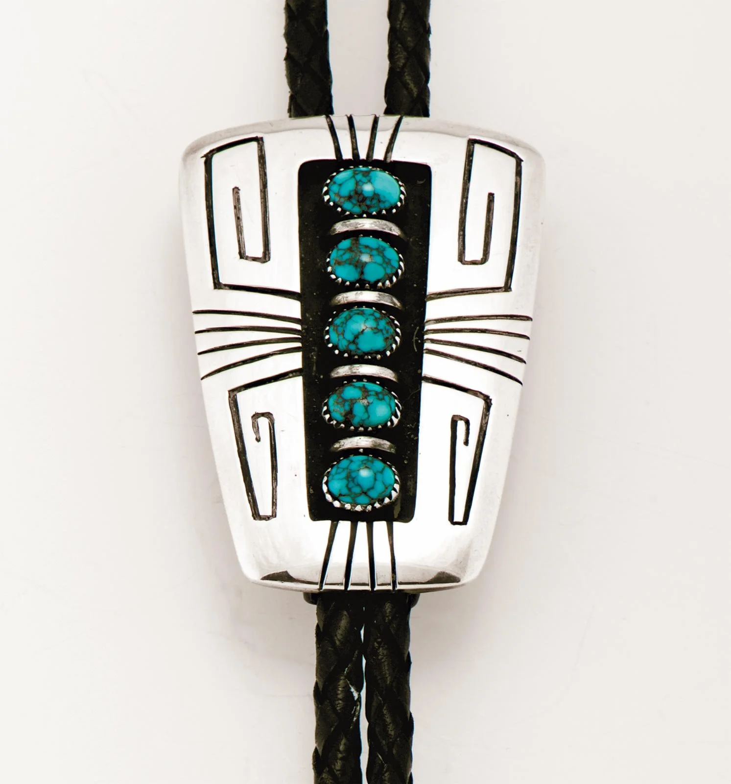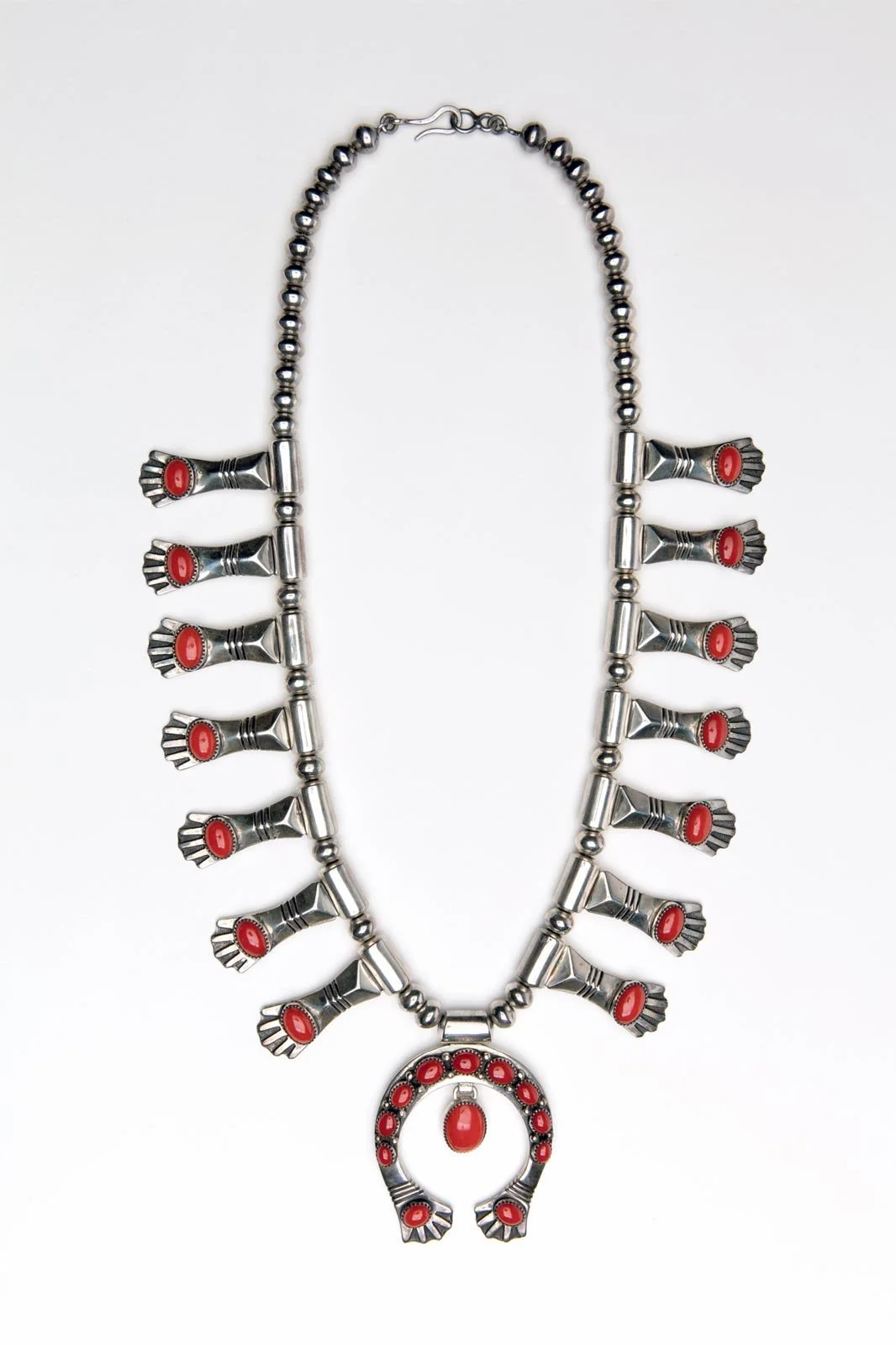 WHEELWRIGHT MUSEUM OF THE AMERICAN INDIAN presents “Silver Honors Stone: The Work of Julian Lovato” from April 10 through October 17, 2026. The exhibition is the first solo show dedicated to jeweler Julian Lovato (Santo Domingo, 1925 - 2018), his career, and influence on Native American jewelry. Benefitting from the generosity of private lenders, and institutional loans from the Heard Museum, the exhibition will feature 80 works. Lovato had a long and prolific career, creating works of composed beauty known for their raised dimensional design. Lovato’s career maps the ways in which the Native American jewelry field flexed and changed over the course of the twentieth century. In his teens, Lovato worked for Maisels in Albuquerque. After serving in Japan he worked at the Thunderbird Shop in Santa Fe, moving to Packards in the mid-1960s. By the 1970s, he had set up his own studio in Kewa Pueblo, working closely with his wife Marie O. Lovato. Shown: Hollowform silver bracelet with set coral, made by Julian Lovato while at Packards. Wheelwright Museum Collection. Ring of silver and turquoise. Stephen Schultz collection; 45 Lone Mountain bolo tie of silver and turquoise. Photograph by Arland Ben. Published in Turquoise In America Part Two, 1910-1990, © Callais Press 2020; Necklace of silver and coral with hands and naja by Julian Lovato. Wheelwright Museum Collection.