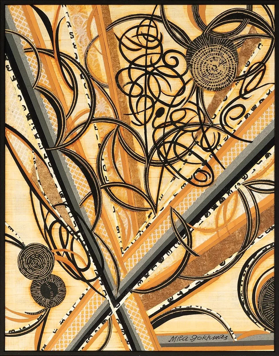 CYPRESS COLLEGE hosts “Blue Vibrations: Mila Gokhman. A Retrospective,” from March 12, 2026 through April 16, 2026. This exhibition, which mainly features her paper collage wall pieces, is only a small fraction of the volume of work she has made over the decades, since 1967, which she credits as the year she was born as an artist. All the work is for sale, and proceeds go directly to the artist. Also showing concurrently is “Resilience”. Addressing themes of belonging, identity, and self-worth, RESILIENCE highlights the work of five professional artists who are also highly trained art therapists: Sara DeSmet, MA, MFA, LMFT, ATR; Alexia Kutzner, DAT, MA, MFA, LMFT, ATR-BC; Maria Elena Fuster, PhD, LMFT, ATR-BC; Eliza Ann Mitchell, MA, LMFT, ATR-BC; and Licia Wise, MA, LMFT. Shown: Light and Shadows #1 by Mila Gokhman of paper collage, 2021; Mila Gokhman wearing her own hat and handmade leather jewelry. Photograph by Phillip Ritchie.