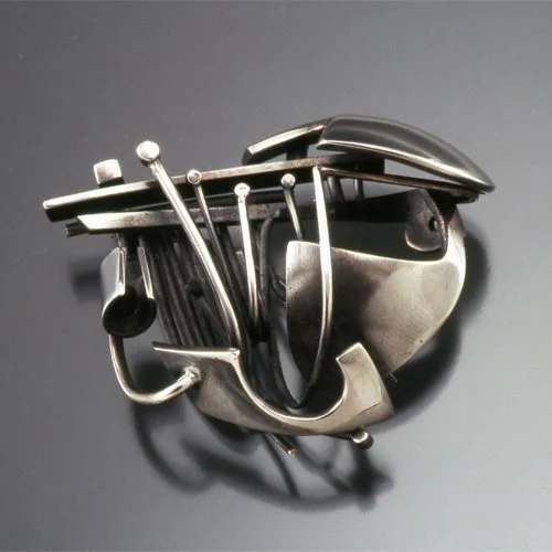 Brooch by Helen Shirk of silver, 1.75 x 1.5 x .75 inches, 1967. Courtesy of the Artist.