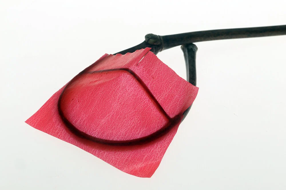 These tight radius bend black bamboo components were used as a pendant on an intertwined torque, and two styles of earrings. I felt the bends from freshly culled bamboo had that wonderful lyrical feel reminiscent of plant growth and form that I try to capture in my jewelry. In order to add the color that is suggestive of flowers, or seed pods, I integrated square wire matrices into the bamboo bends, then attached red Coverlite. Since model airplane coverings are films and not fabrics, they do not drape or fit well into small crevices or discontinuities. Therefore when you are working with Coverlite or similar materials, you have to keep gaps to a minimum. In order for such polyester films to really heatshrink, every attachment surface must be uniformly glued. When glued and heatshrunk, this model airplane covering brings both color and pleasing geometric planes into play for these very light, yet strong earrings.